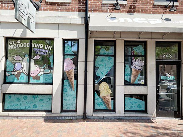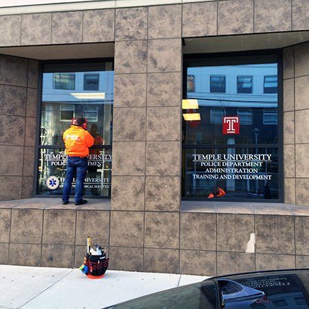 Exterior window graphics are available in an array of material for long or short-term usage. Graphics can be applied to either the exterior (1st surface) or interior (2nd surface) depending upon the material. Static cling, RTA vinyl, perforated vinyl and transparent films are just a few of the material we install.